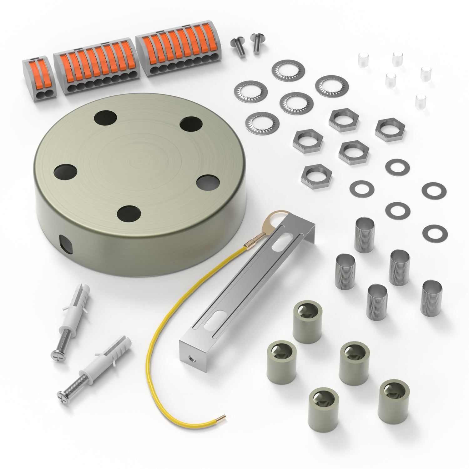 Dieses Calex Baldachin aus Metall mit ein Loch is in der Farbe Matt Bronze. Dieser Deckenbaldachin is für 5 Kabel geeignet, das sowohl 2-polig als auch 3-polig sein kann.