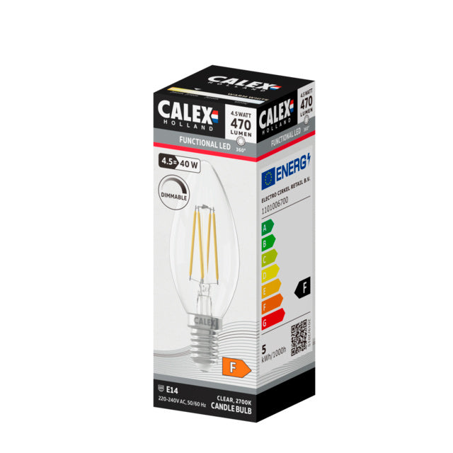 Diese Calex LED Straight Filament-Kerzenlampe mit klarem Glas hat einen kleinen Lampensockel/Fassung (E14). Diese Kerzenlampe hat eine Lichtleistung von 470 Lumen, eine Lichttemperatur von 2700 Kelvin und strahlt somit warmweißes Licht aus. Der Verbrauch dieser Lichtquelle beträgt 4,5 Watt. Die Lampe hat einen Durchmesser von 35 mm und eine Höhe von 98 mm. Diese Lampe ist dimmbar mit einem LED-Dimmer.