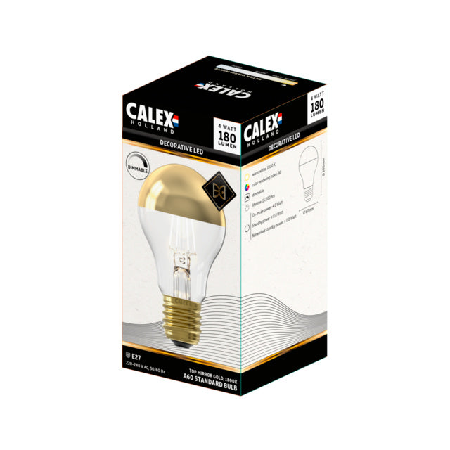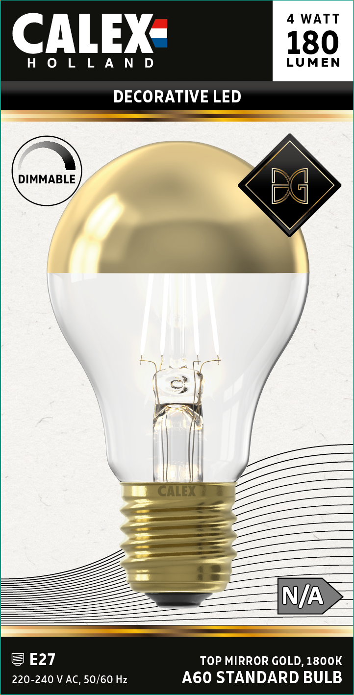 Dieses Modell hat einen Durchmesser von 60 mm, eine Höhe von 105 mm und ist für Fassungen mit E27-Gewinde geeignet. Dieser silberne Halbspiegel (Modells A60) hat einen Verbrauch von 4 Watt, hält 15.000 Brennstunden und hat eine Lichtintensität von 180 Lumen. Dimmbar mit einem LED-Dimmer.
