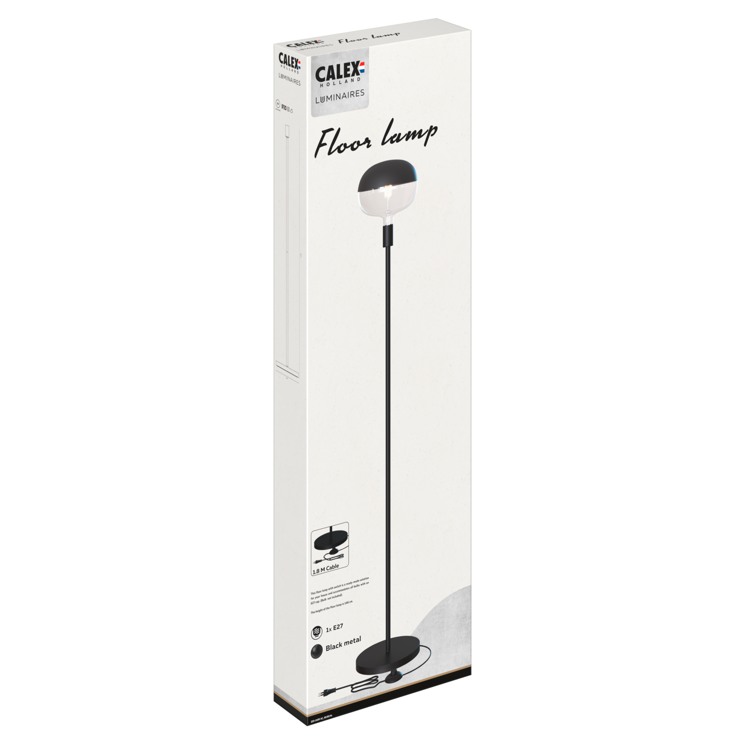 Die Calex Stehleuchte E27 ist eine schwarze Stehleuchte mit einem Metallgehäuse und einem einfach zu bedienenden Ein-/Aus-Schalter am Kabel. Dank ihres zeitlosen Designs und der großzügigen Kabellänge von 1,8 Metern können Sie sie flexibel dort aufstellen, wo Sie Licht benötigen. Die Lampe hat einen stabilen Fuß mit einem Durchmesser von 26 cm und eine Gesamthöhe von 146 cm.