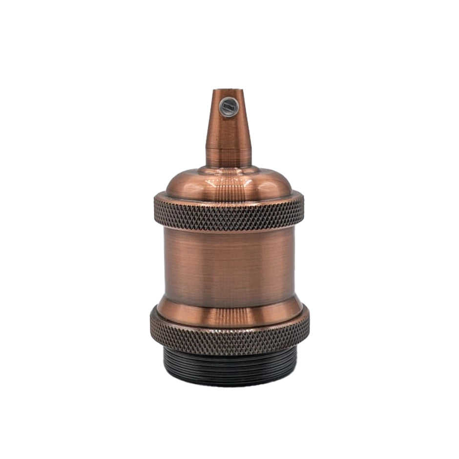 Dies ist die 'Bernt' Fassung aus Metall mit einem markanten Metallrand (oben und unten) in der Farbe kupfer mit einem E27-Gewinde. Diese Fassung ist 84 mm hoch, hat einen Durchmesser von 50 mm und ist geeignet für 2-polige Kabel.