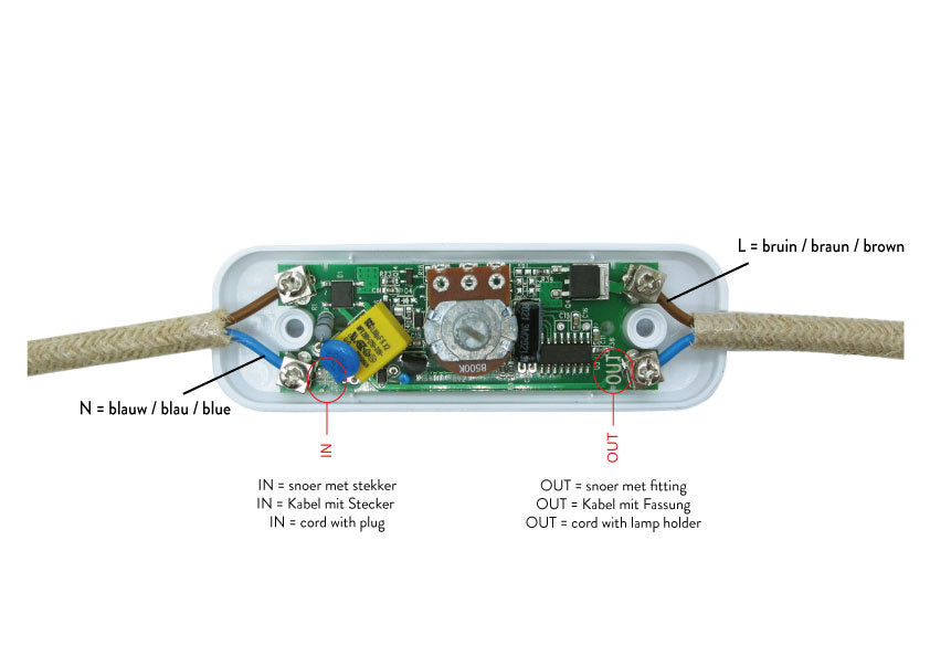 Dieser schwarze Universal-Schnurdimmer hat eine Länge von 100 mm, eine Höhe von 37 mm und eine Breite von 32 mm. Der Kabeldimmer verfügt über einen Drehknopf, mit dem Sie Ihre LED-Lampen dimmen können.