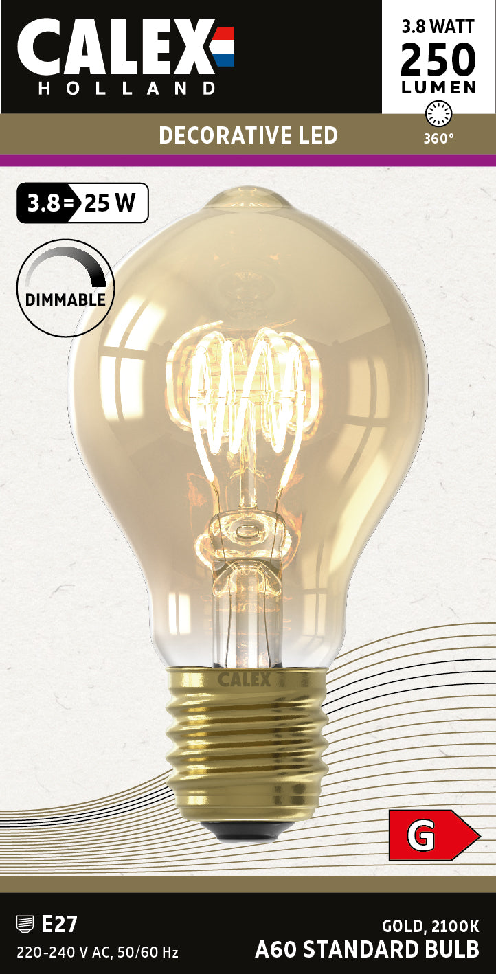 Dieses Curved Flex-Filament-Modell hat einen Durchmesser von 60 mm und eignet sich für Fassungen mit E27-Gewinde. Die titanfarbene Lichtquelle des Modells A60DR hat eine Lichtintensität von 250 Lumen und hat eine Leistungsaufnahme von 3,8 Watt. Die Farbtemperatur ist mit 2100 Kelvin extra warm.