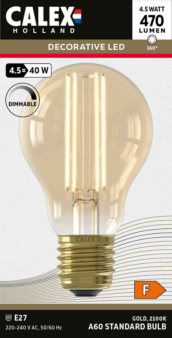 Calex. Die Lichtquelle hat eine Lichtintensität von 470 Lumen, hat eine Leistungsaufnahme von 4,5 Watt und hat eine Farbtemperatur von 2100 Kelvin (extra warmes Licht - CRI80).