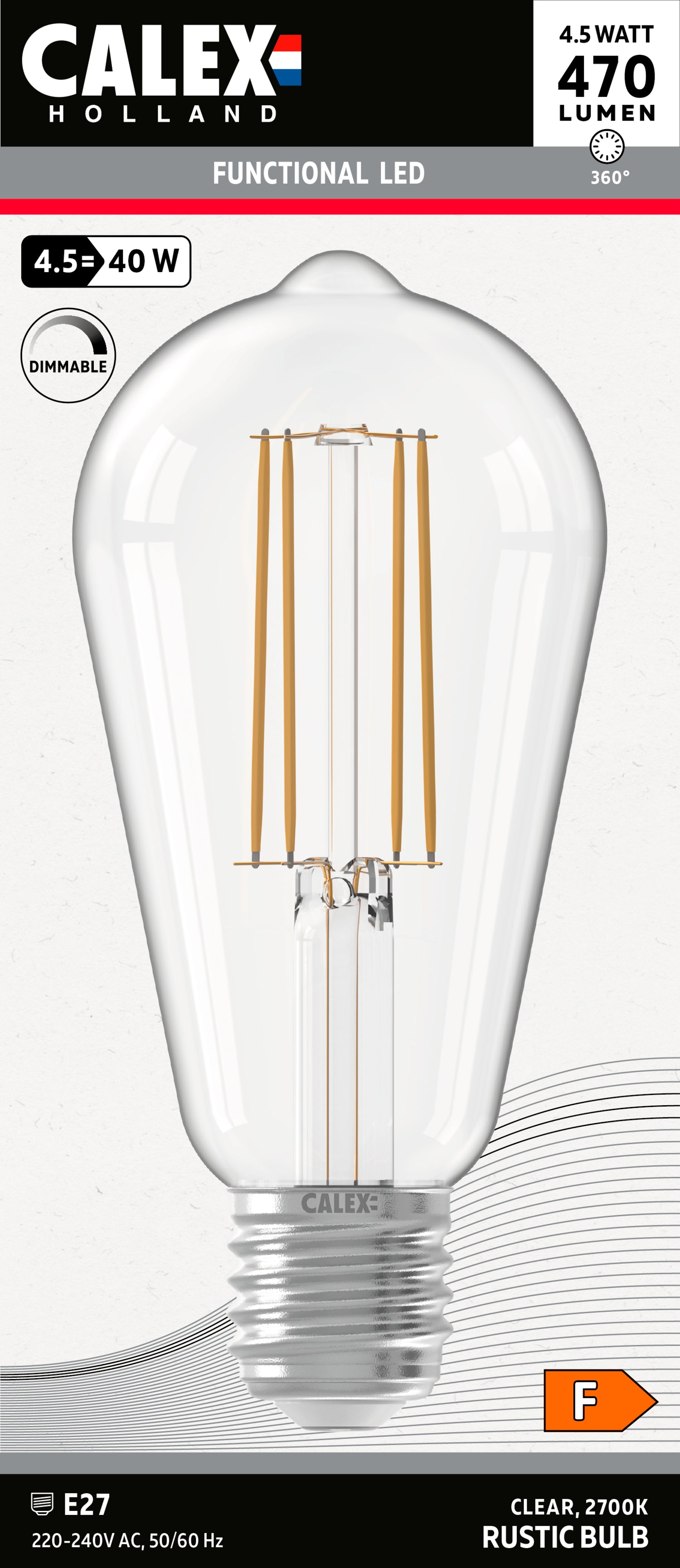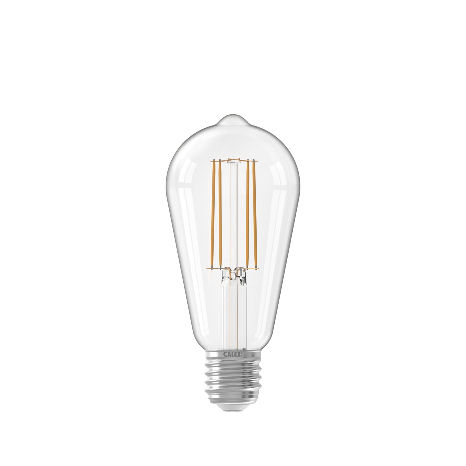 Diese dimmbare Eichhörnchenkäfig-Langfilamentlampe ist eine Klare LED-Lampe (Modell ST64) der Marke Calex. Die Lichtquelle hat eine Lichtintensität von 470 Lumen, eind Verbrauch von 4.5 Watt und eine Farbtemperatur von 2700 Kelvin (extra warmes Licht).