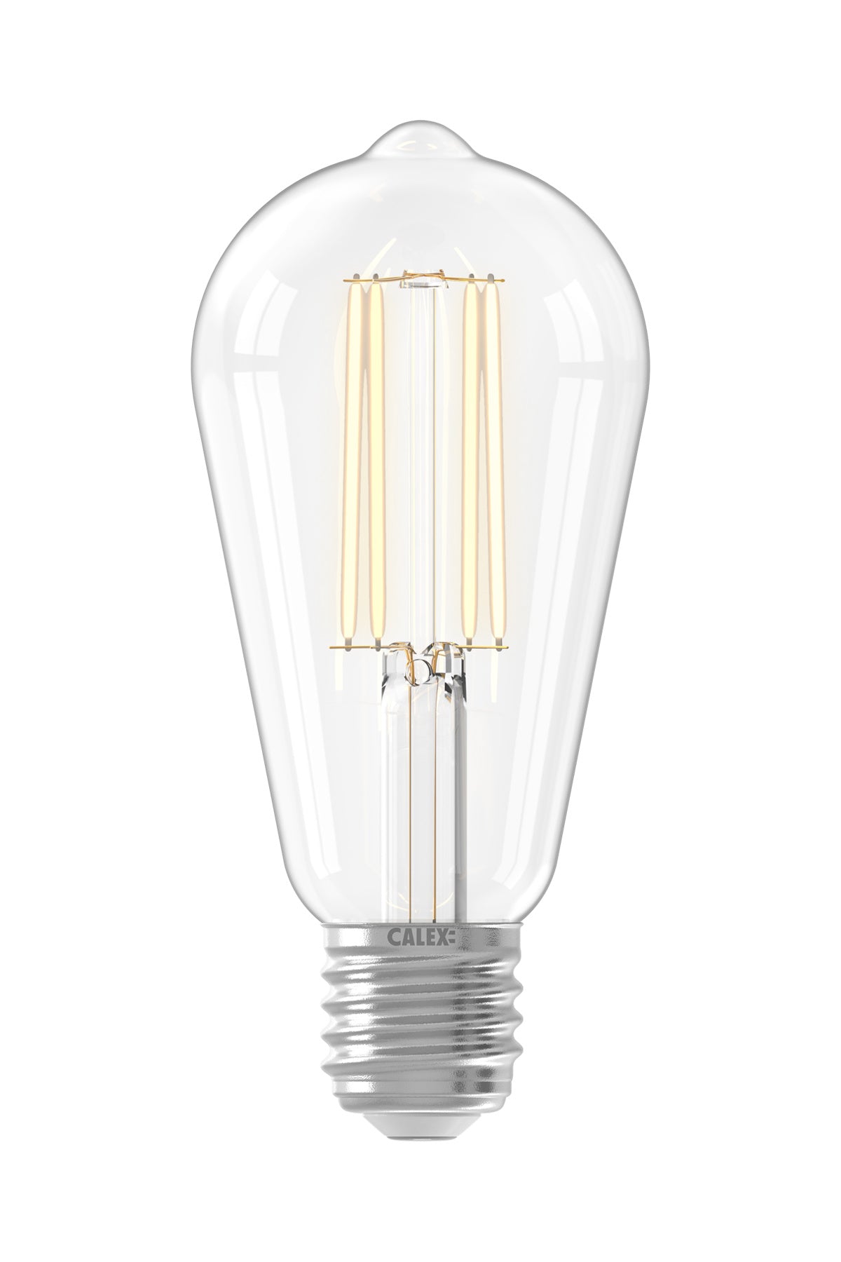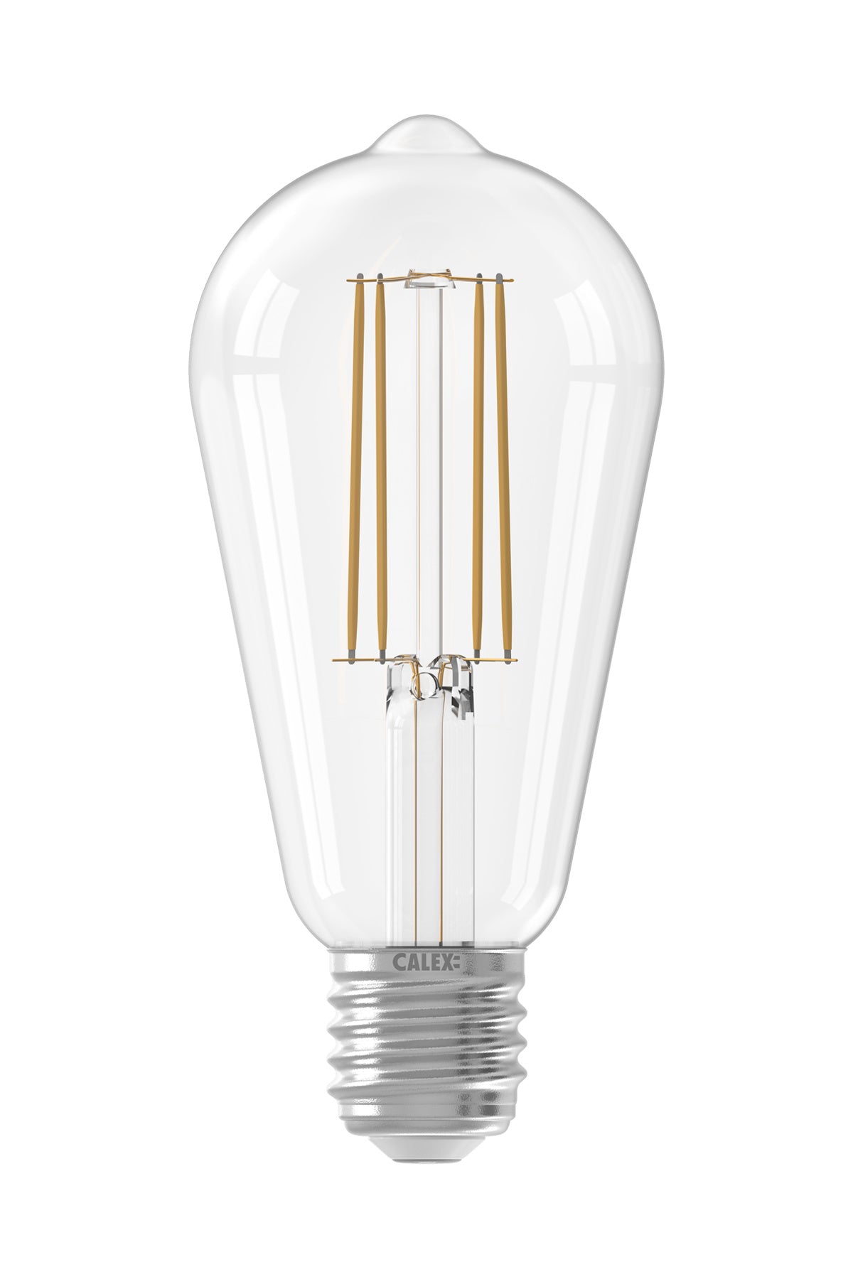 Diese dimmbare Eichhörnchenkäfig-Langfilamentlampe ist eine Klare LED-Lampe (Modell ST64) der Marke Calex. Die Lichtquelle hat eine Lichtintensität von 250 Lumen, eind Verbrauch von 3,5 Watt und eine Farbtemperatur von 2300 Kelvin (extra warmes Licht).
