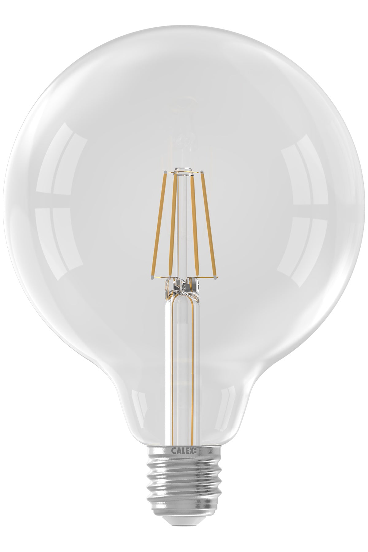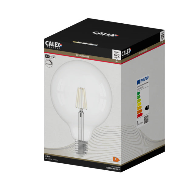 Diese dimmbare Globe LangFilament ist eine Klare LED-Lampe (Modell G125) der Marke Calex. Die Lichtquelle hat eine Lichtintensität von 470 Lumen, hat eine Leistungsaufnahme von 4,5 Watt und eine Farbtemperatur von 2100 Kelvin (warmes Licht - CRI80).