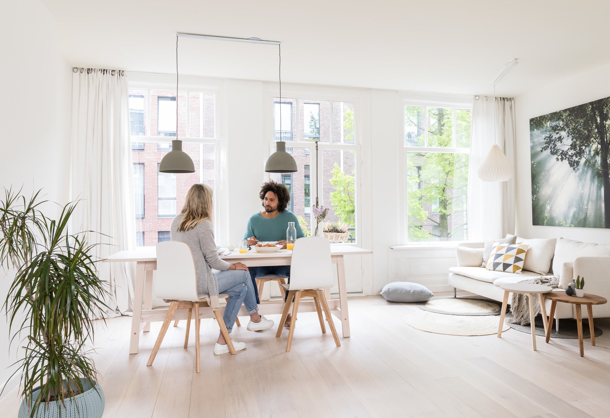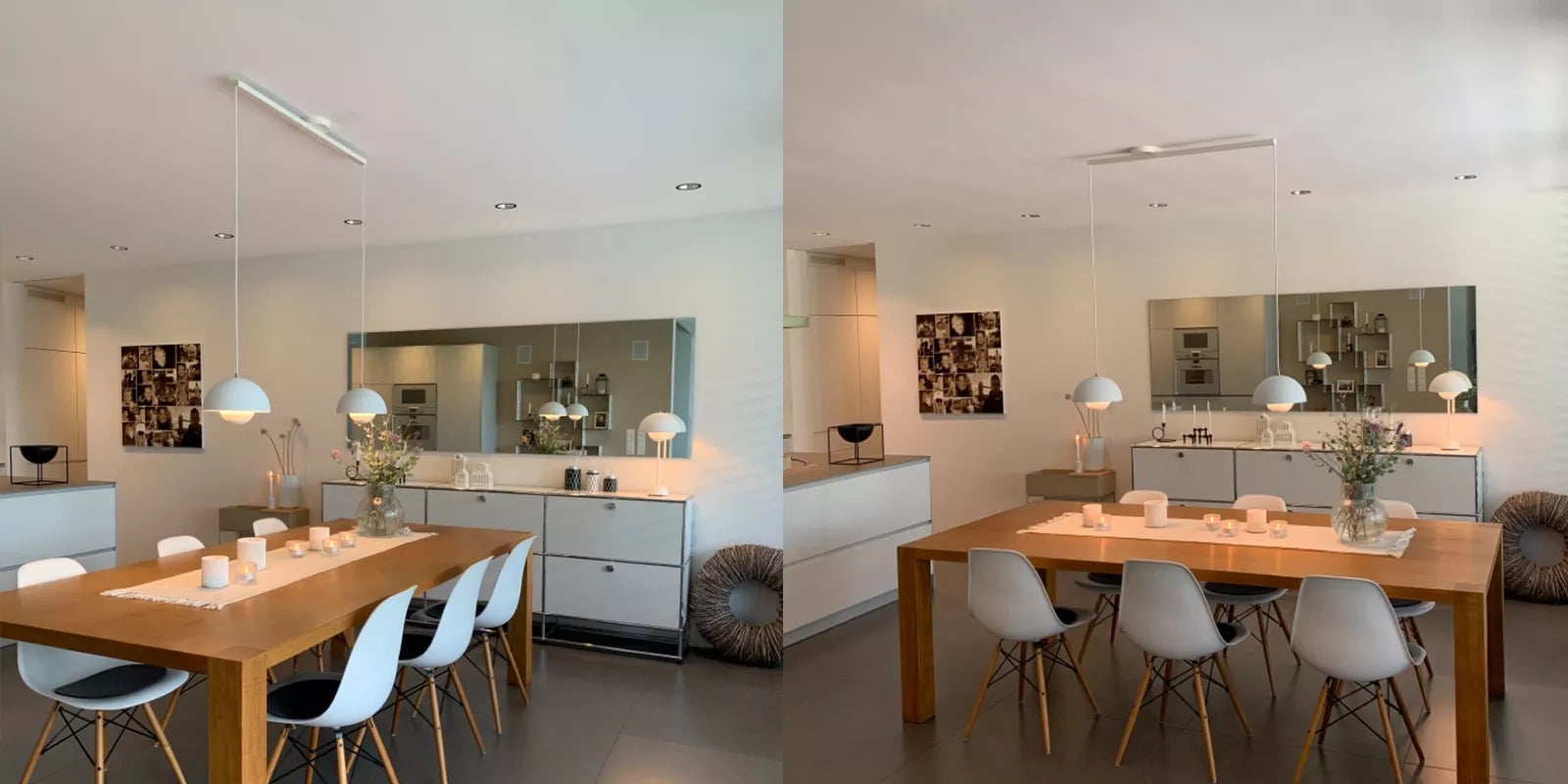 Wenn Sie den Tisch umstellen oder die Einrichtung verändern, sind keine neuen Löcher in der Decke nötig. Auf diese Weise ist das Problem von hässlichen Kabelrinnen und frei hängenden Kabeln endgültig gelöst. Außerdem können Sie dank des speziellen Quick release Ihre Hängelampe vorübergehend vom Lightswing abhängen, was bei einem Fest praktisch ist.