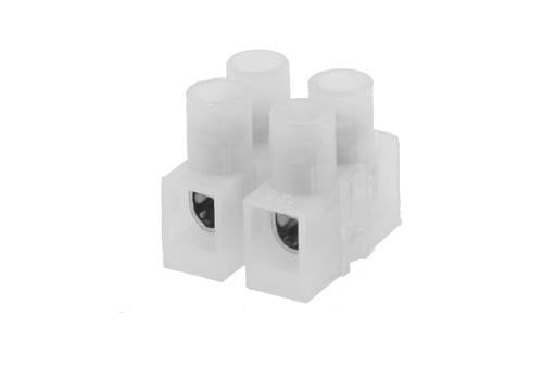 Diese Lüsterklemme enthält Blöcke aus Kunststoffisolationsmaterial, in denen sich Messingröhrchen mit auf beiden Seiten einem Messingbolzen durch einen verdickten Teil der Wand befinden. Darin steckt ein Schraubgewinde.