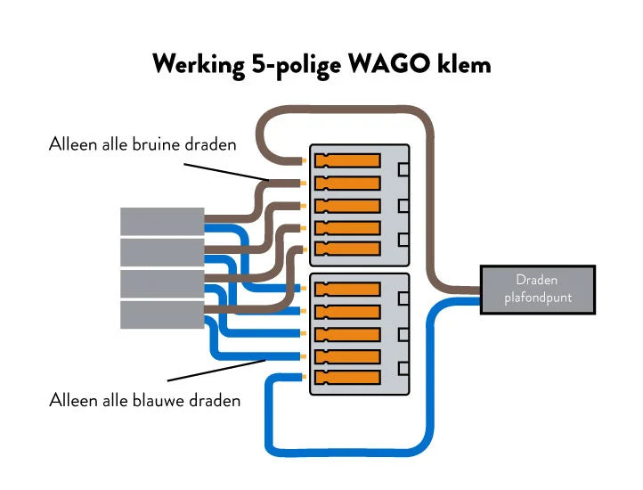 Bevor Sie beginnen, sollten Sie wissen, dass Sie 1 Wago-Klemme pro Farbe des Stromkabels verwenden. Bei einem 2-poligen Kabel (blaue + braune Drähte) verwenden Sie daher 2 separate Klemmen. Für ein 3-poliges Kabel verwenden Sie 3 Klemmen. 1 Klemme für alle blauen Drähte, 1 Klemme für alle braunen Drähte und 1 Klemme für alle gelb/grünen Drähte.